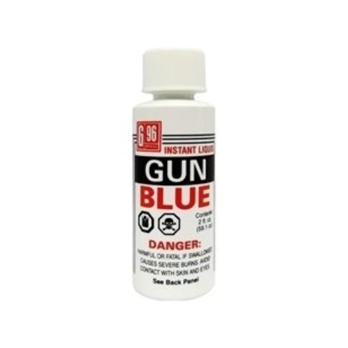 Remove all oil, grease, or dirt from surface to be blued by cleaning with G96 Gun Degreaser.  Pitted or rusted surfaces should be sanded lightly with emery cloth or steel wool.  Apply a small amount of G96 Gun Blue liquid with a clean patch.  After blueing is achieved (after turning greyish, usually within 15-30 seconds), neutralize area with water.  Wipe dry and apply a protective coating of G96 Gun Treatment or G96 Gun oil or G96 Synthetic CLP Gun Oil for a long lasting lustrous finish.  Better penetration is achieved if metal is slightly warm.  Wash hands after use.